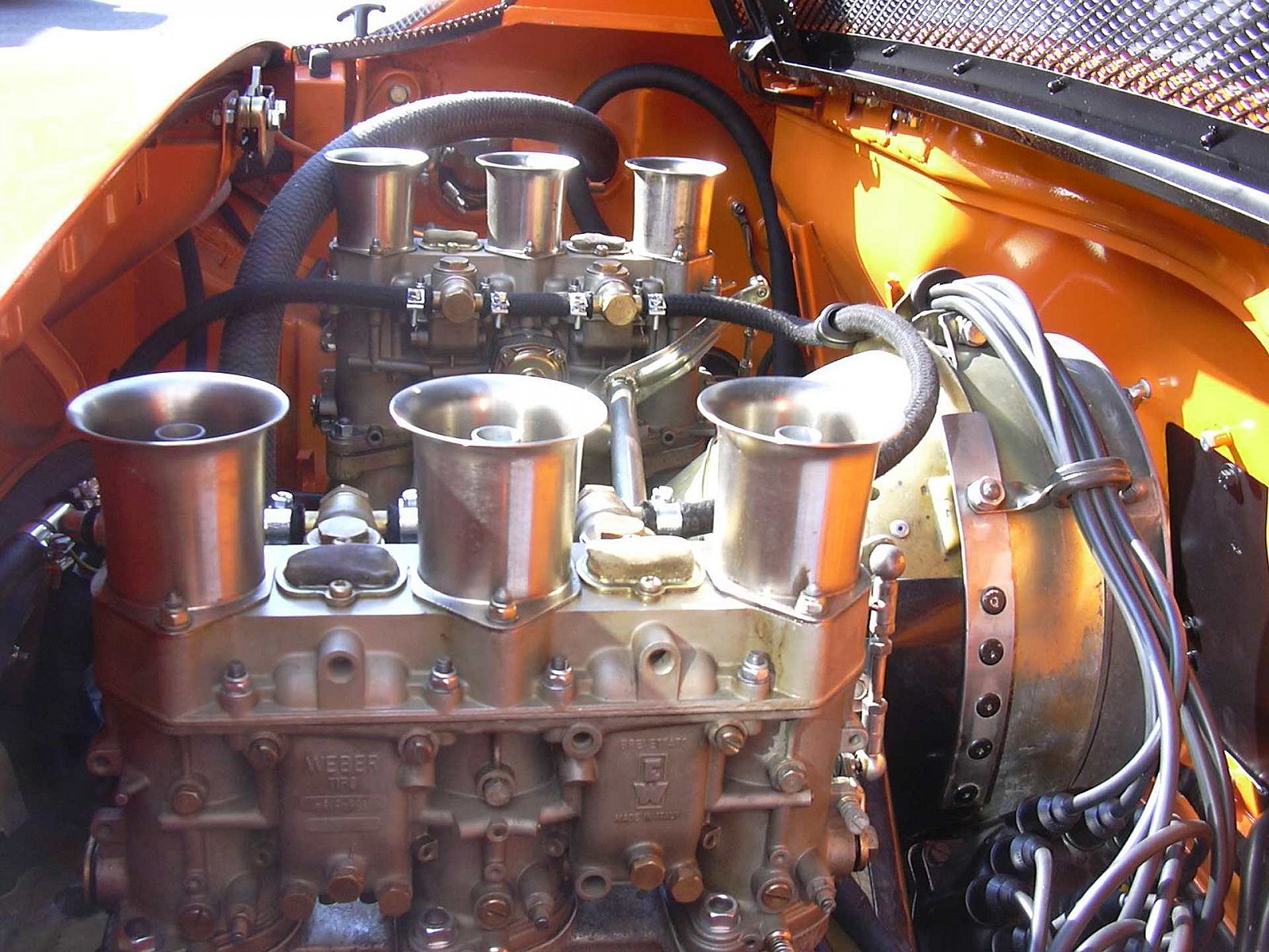 2,0l Carrera 6 Motor mit Doppelzündung, 46er Vergasern nach Rundstreckenspezifikation, 220 PS, Fächerkrümmer mit Sportauspuffanlage, Frontölkühlanlage mit Luftführungsschacht, thermostatisch geregelt